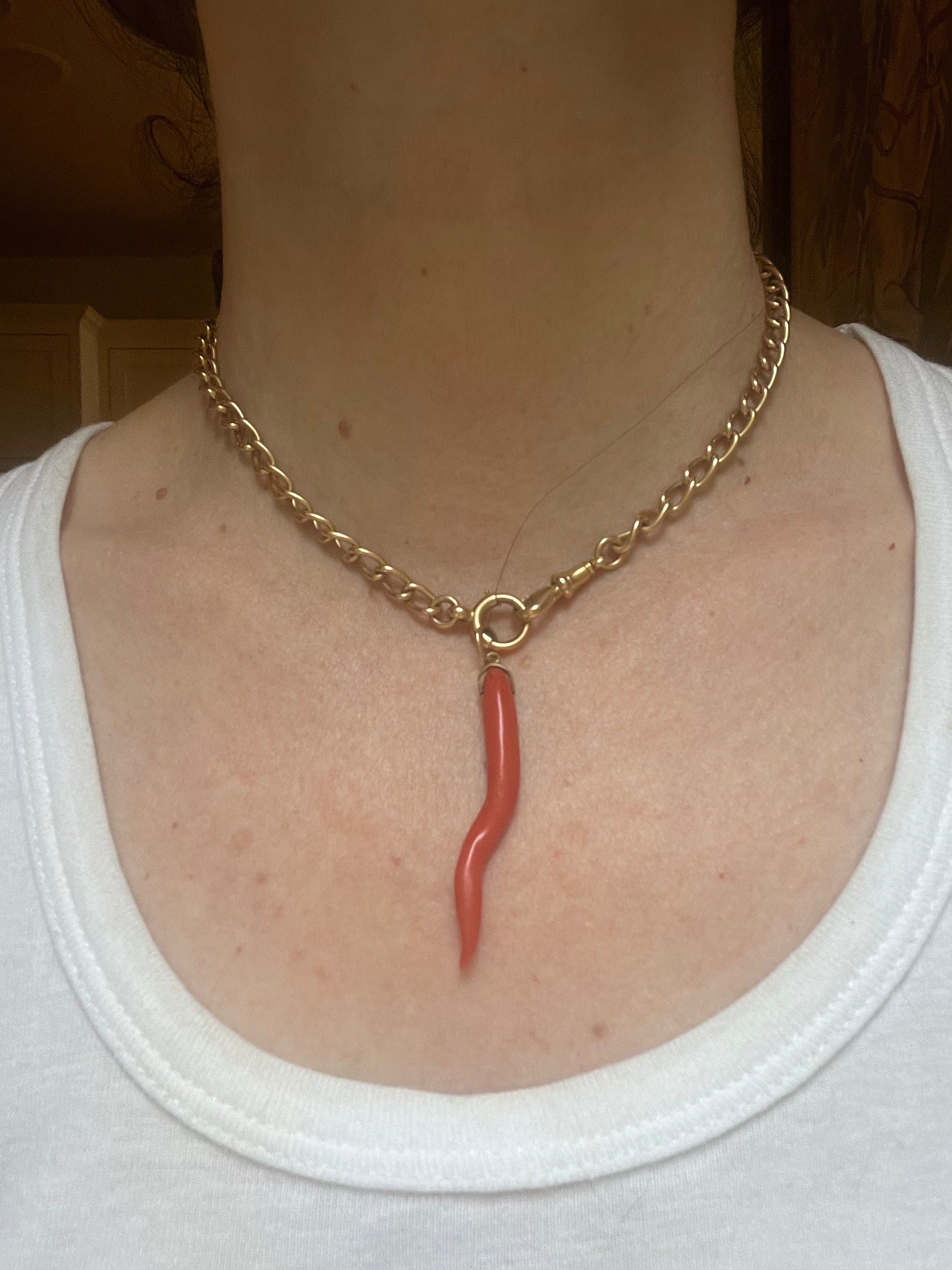 A "cornicello" is an Italian horn charm worn as a talisman for good luck and protection. It is believed to ward off the "malocchio" or evil eye, and symbolizes fertility, prosperity, and Italian heritage. The charm is a twisted horn shape that resembles the horns of sacred animals and is thought to have ancient origins dating back to Neolithic times.