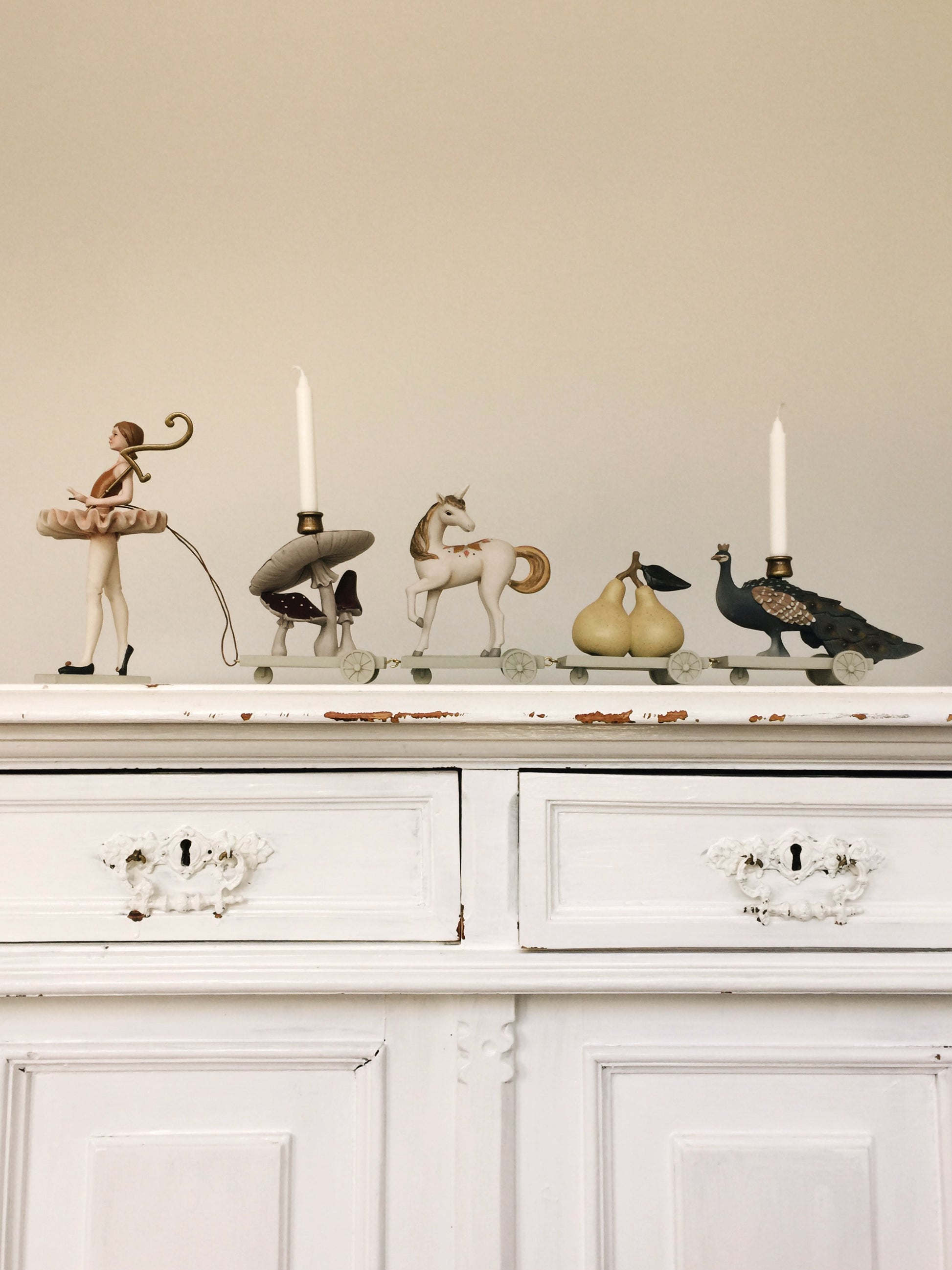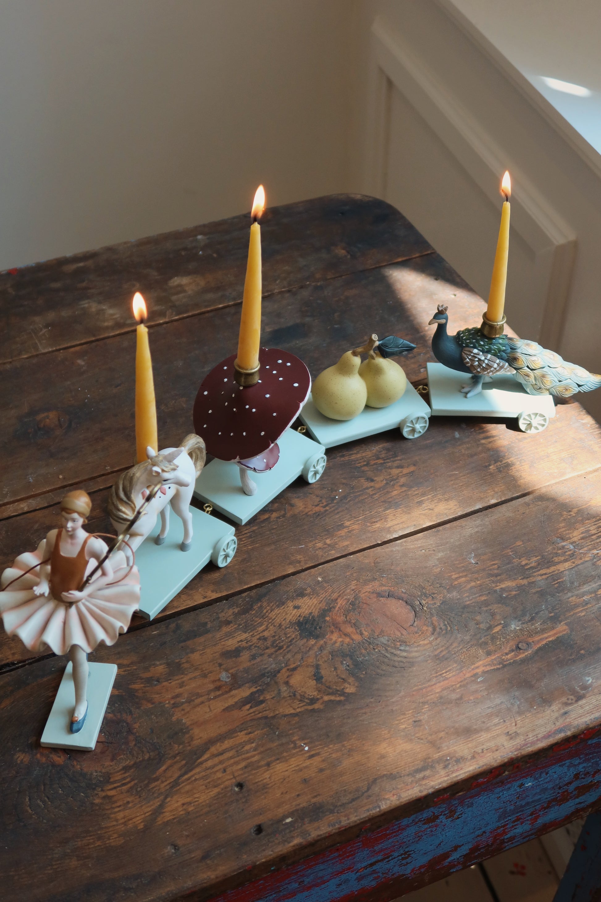 This uniquely handcrafted birthday train will dress every birthday table with stylish finesse, and is usable for every age. Choose between: - Pierrot walking with a lemon, a goose, a circus tent, a lion and a monkey. - Ballerina walking with mushrooms, a unicorn, pears and a peacock. - Strong man walking with a baseball, a blue rose, a rabbit and a gramophone. You will also find candleholders and numbers in the box. Made in 100% Polyresin material. Cleaning instructions: Clean with a damp cloth (max. 30 degrees C). Do not use any chemicals. WARNINGS: Remove all packaging before use. Please burn within sight and keep away from kids, pets, flammable materials and blow out 1 cm above the top of the candleholder and be careful of hot wax after candle is extinguished. The birthday train is NOT a toy and can be used for decoration ONLY. Please make sure not to leave birthday train unattended. Measurements: Length: 69 cm.
