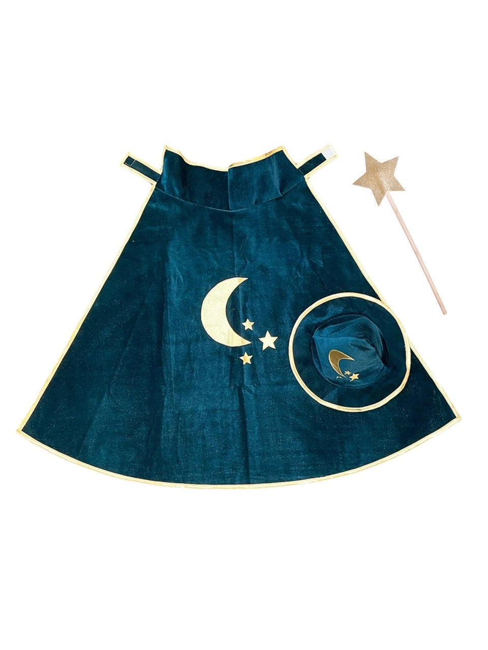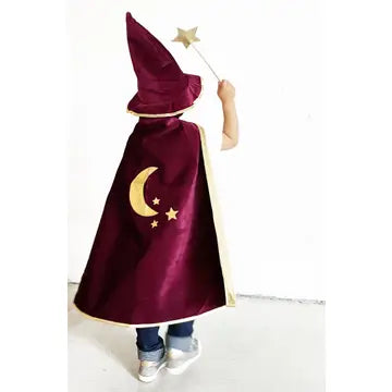 This velvet- and gold-lined wizard cape is tied at the neck with a Velcro strap. Encourages creativity, Encourages imagination. 1 x cape, 1 x hat and 1 x magic wand.