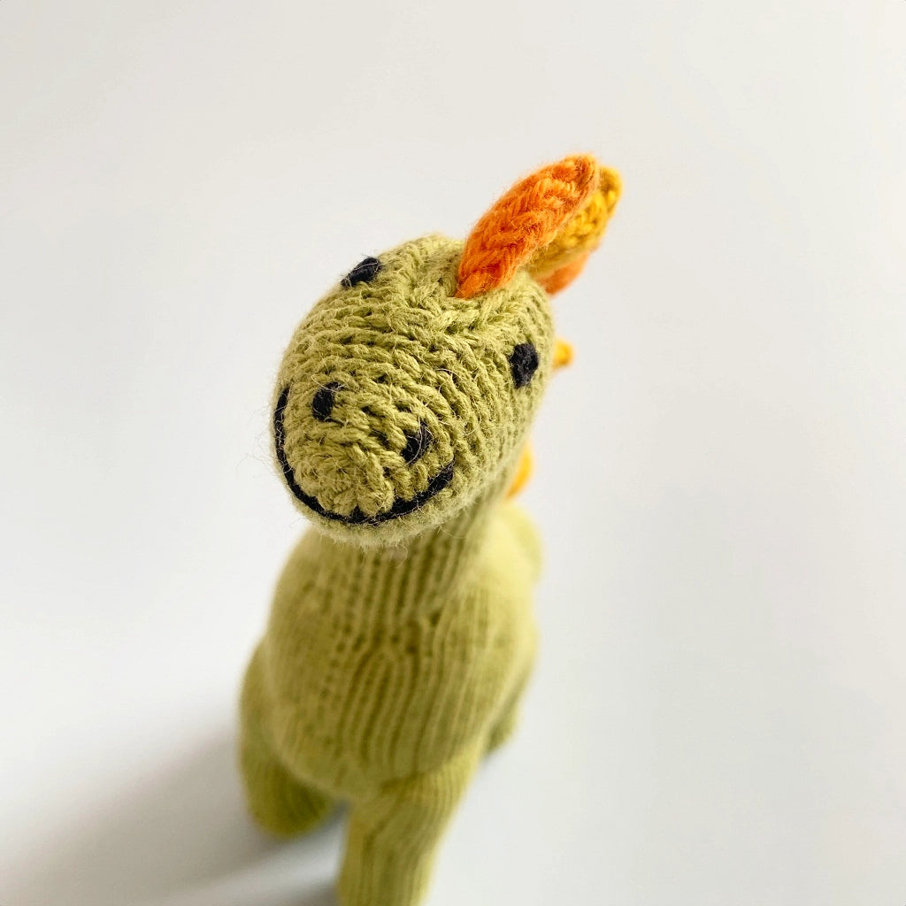 Being extinct has never looked so adorable! Our new brachiosauras rattle is getting rave reviews for good looks and lovability. Handknit in Peru from softest organic cotton, this big guy stands 7.5" tall and is ready to stand guard in nurseries around the globe. For dinosaurs lovers big and small. -Gentle wash on cold and air dry -Organic cotton with poly stuffing -Perfect for grasping, imaginative play and nursery decor.