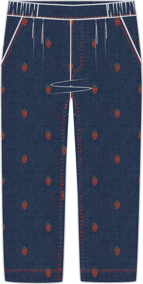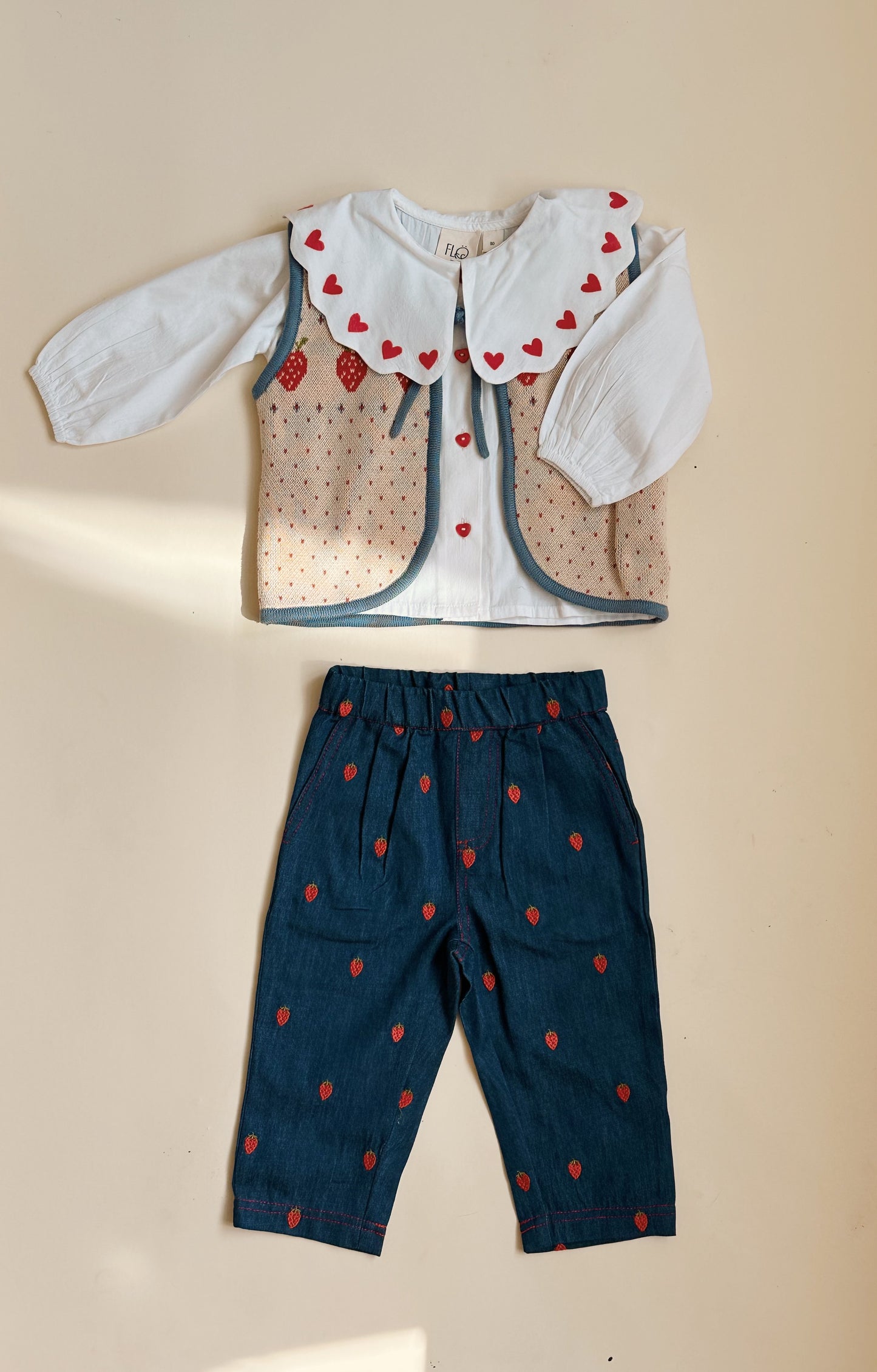 Colette pants in denim with strawberry embroidery, made of organic cotton. Features elastic waistband with drawstrings.
