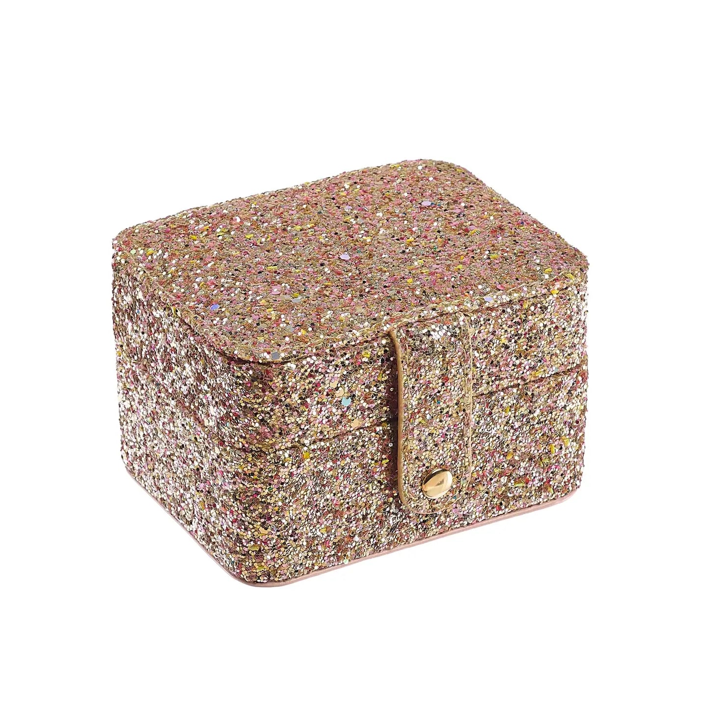 Our gorgeous confetti glitter jewellery box is the perfect place to keep all your Rockahula jewellery and favourite treasures safe! Covered in bright multi coloured and pink sparkling glitter, this jewellery box has a popper fastening to reveal four compartments, a slip pocket and a dedicated space to slot earrings and rings. Dimensions: W 12cm x H 7.5cm x D 9.5cm Made using recycled fabric and paper. Not suitable for children under 36 months due to small parts.