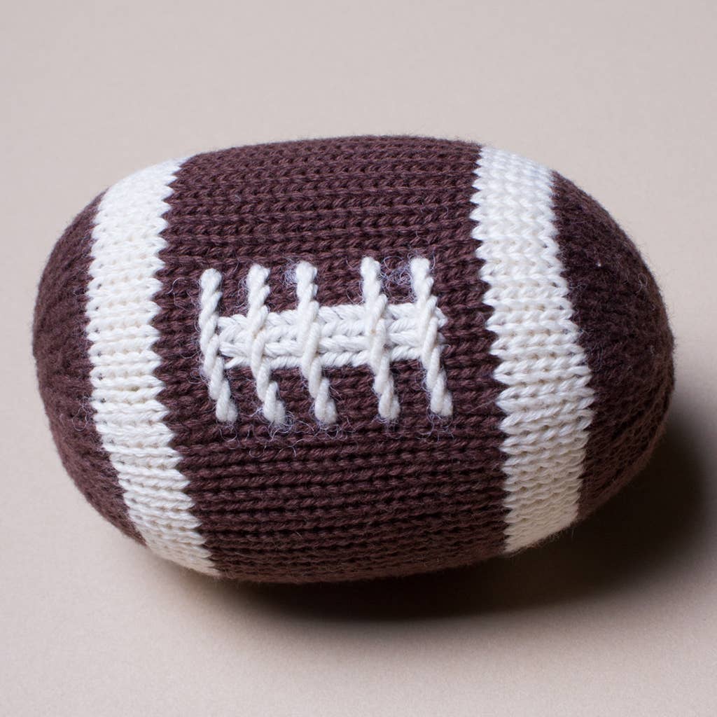 Part of Estella's collection of sports-themed organic baby toys, the football rattle is a clever way to kick off your budding athlete's NFL career. With a melodic rattle sound, rich brown color, and plush feel, this unique rattle is bound to grab and hold baby's attention.