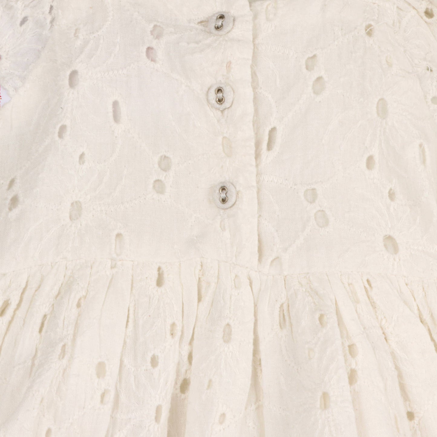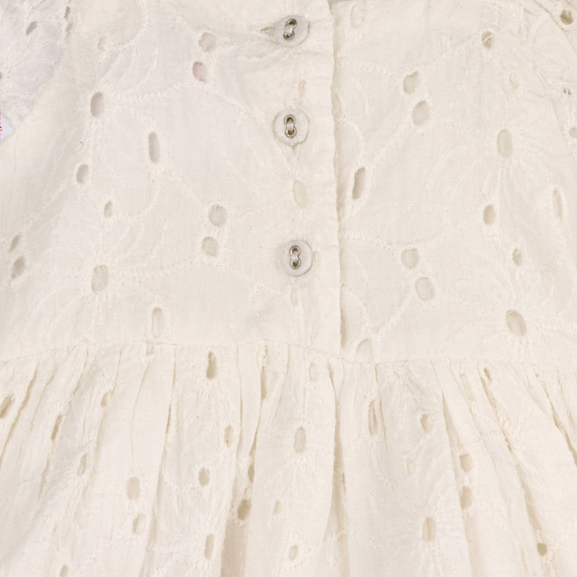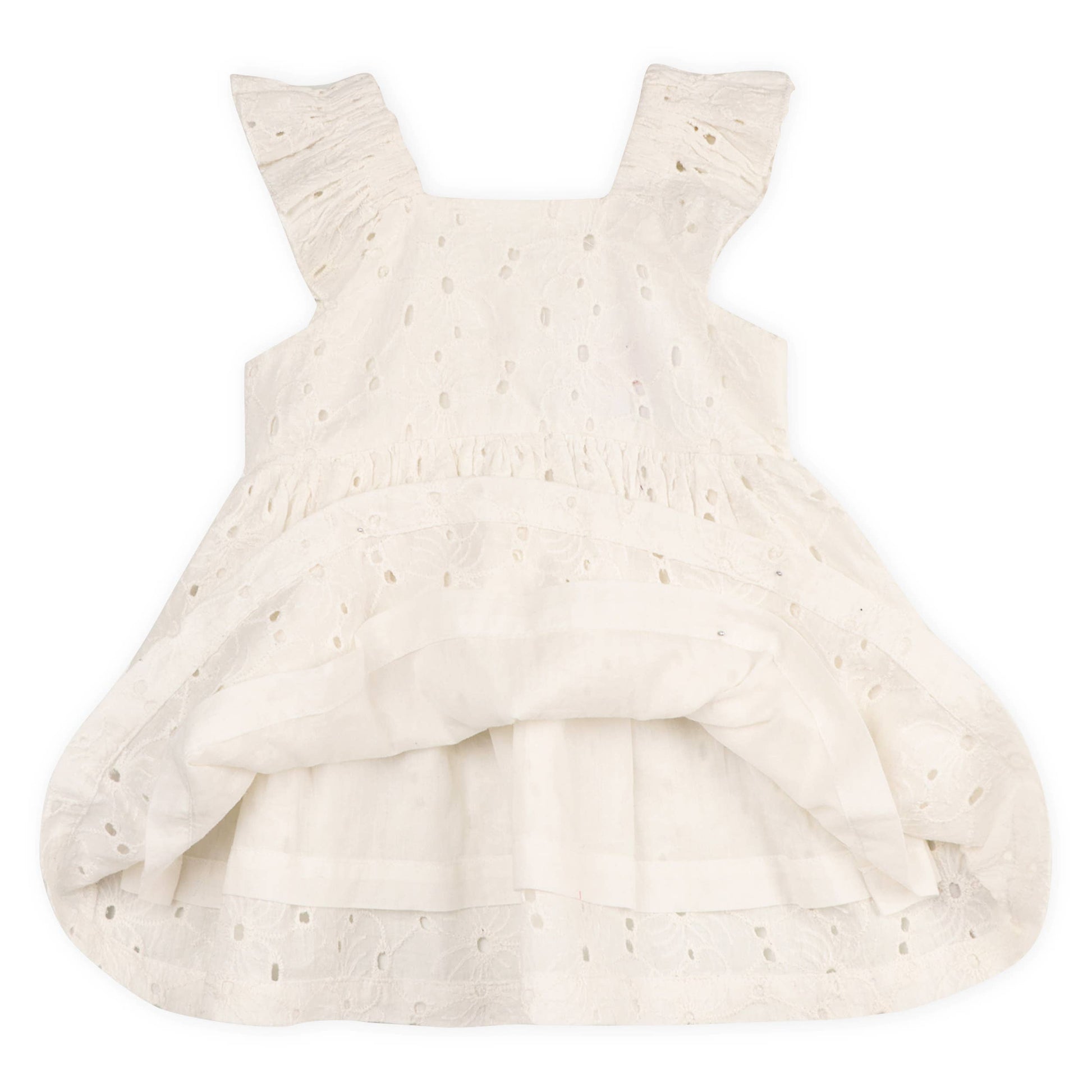 Introducing our exquisite Lily Schiffli Floral Eyelet Baby Girl Dress & Bloomer Set, meticulously crafted from organic cotton for the utmost comfort and elegance. This enchanting ensemble radiates timeless elegant charm with its off-white hue and delicate design details, making it the perfect choice for your little one's special occasions.