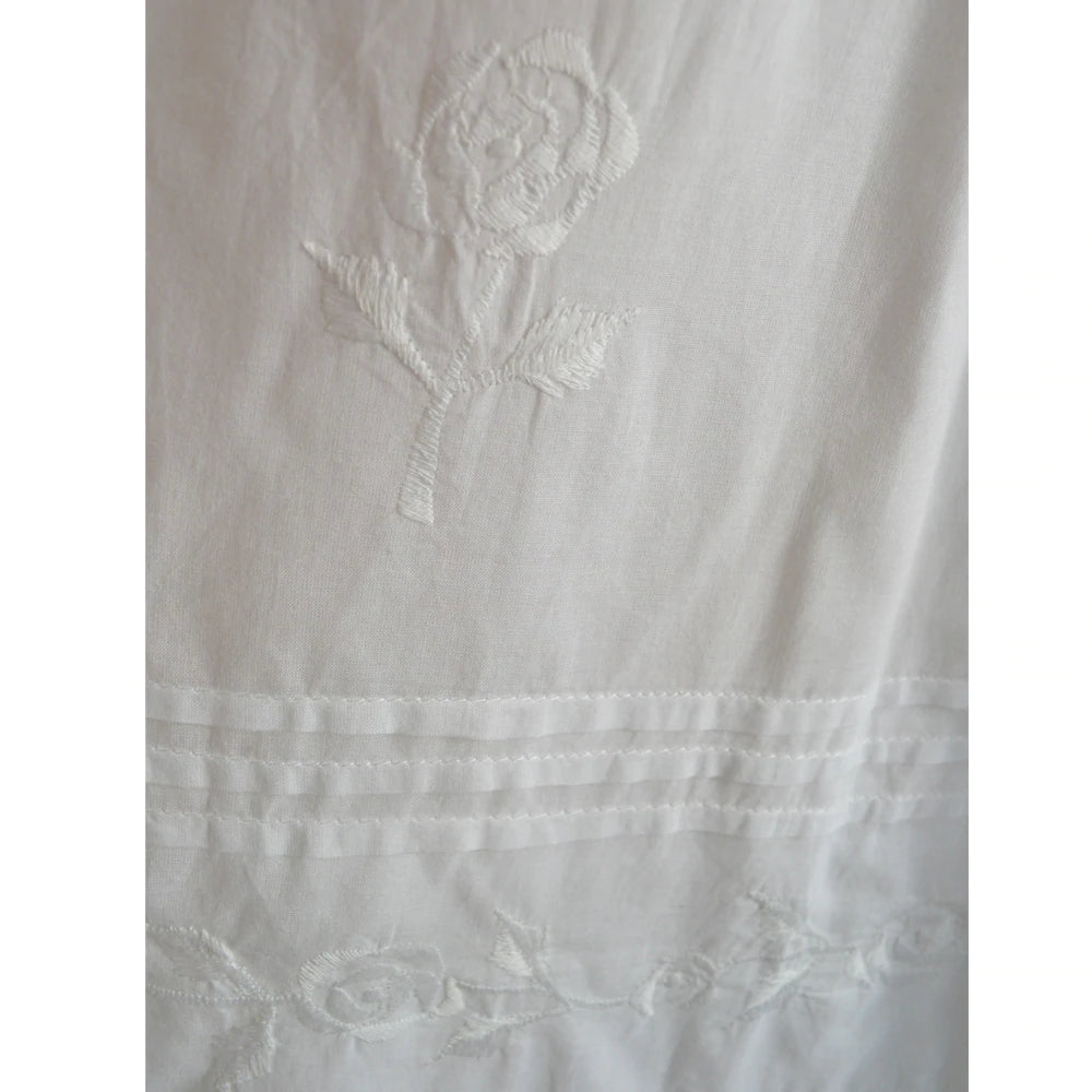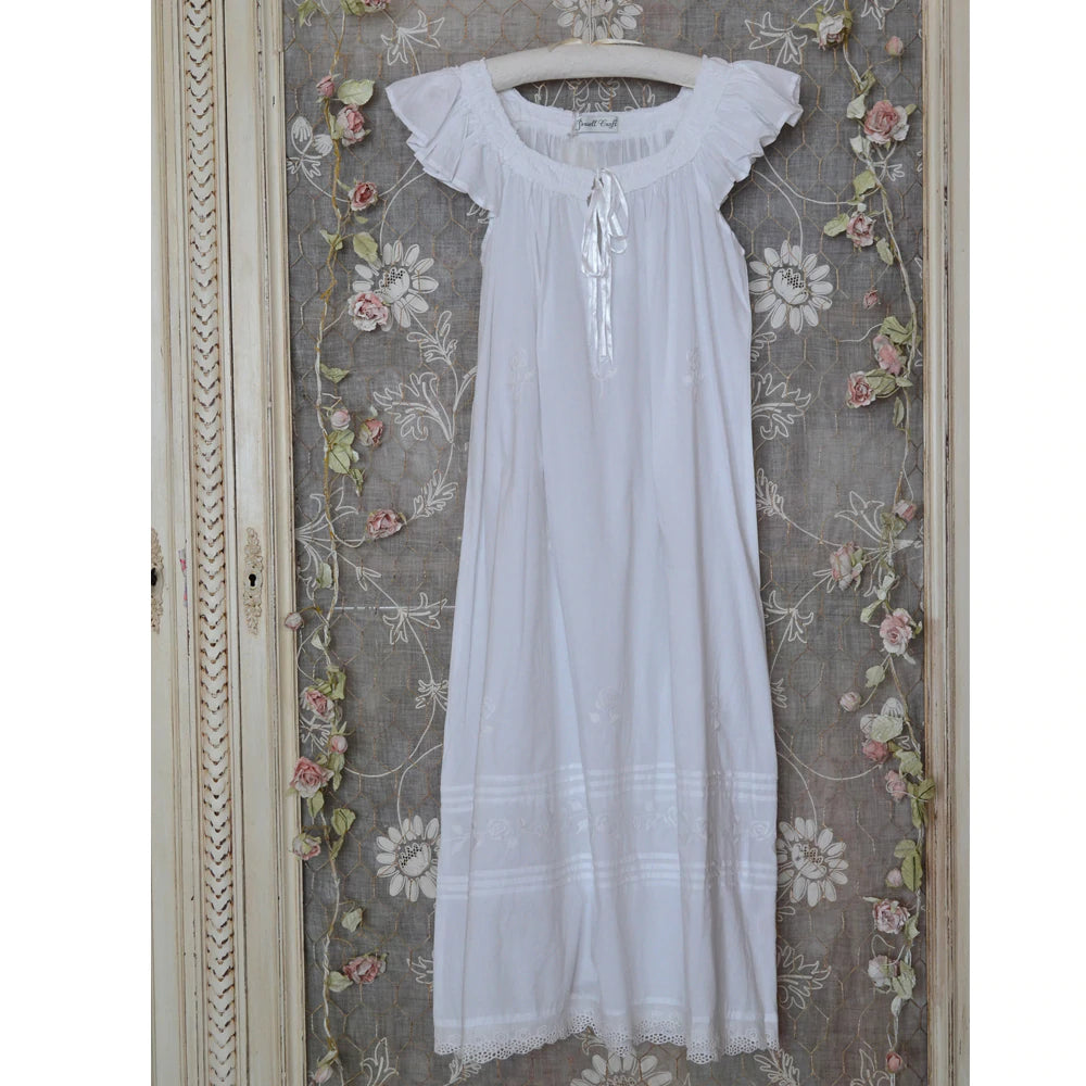 Delightfully feminine nightdress with delicate embroidered white roses strewn on the skirt and as a decorative band between two sets of pin-tucks above the hem. This light and comfortable nightgown features delicate fluttered sleeves, and the beautifully shaped neckline is edged with ruffles and finished with a ribbon tie.