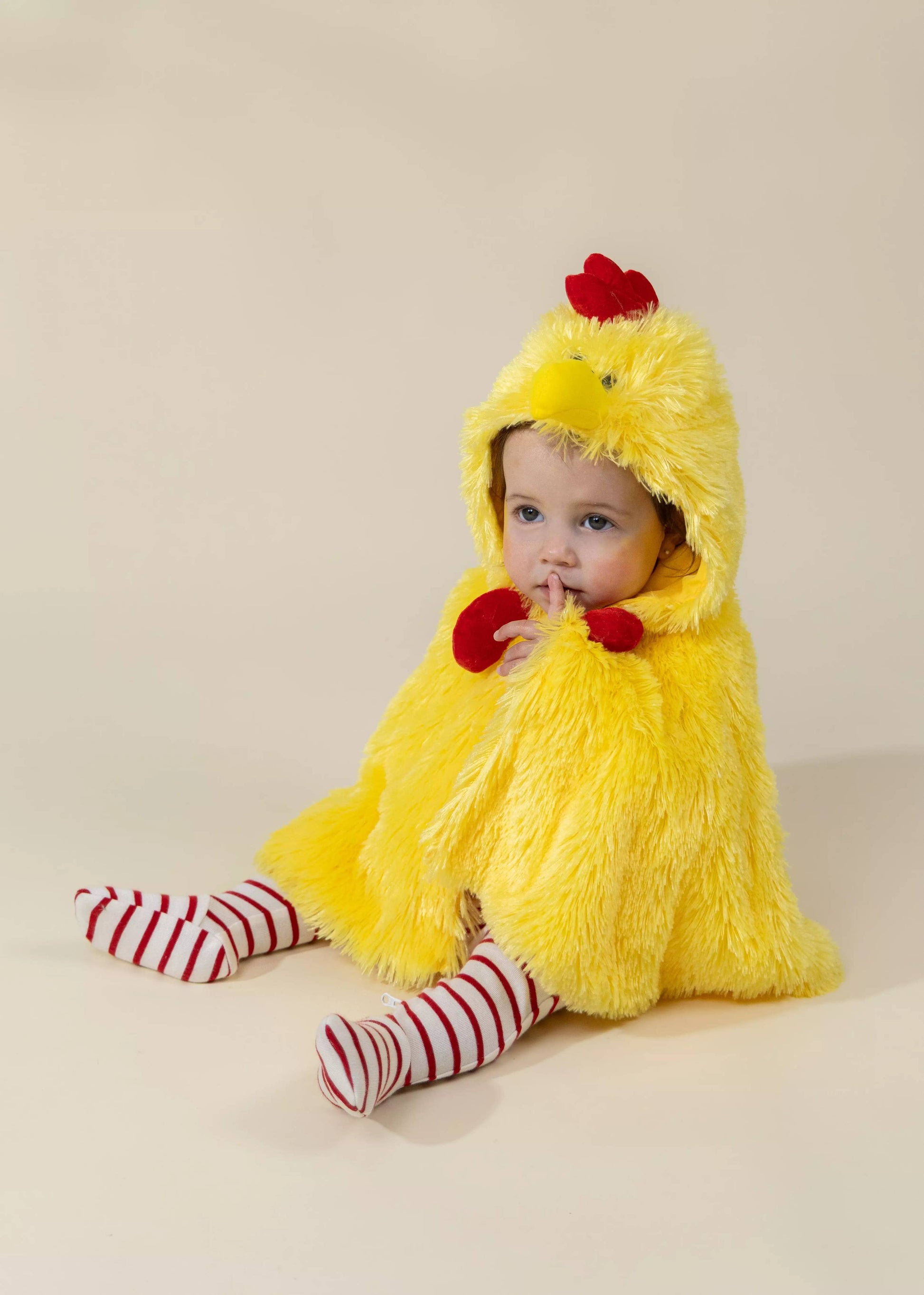 Cluck-cluck! Get ready for some barnyard fun with our cozy Rooster Cape! This soft, fuzzy yellow cape slips on easily and features sweet red comb and beak details. Whether for playtime, daycare dress-up, or a first Halloween, your little chick will be the cutest on the farm.