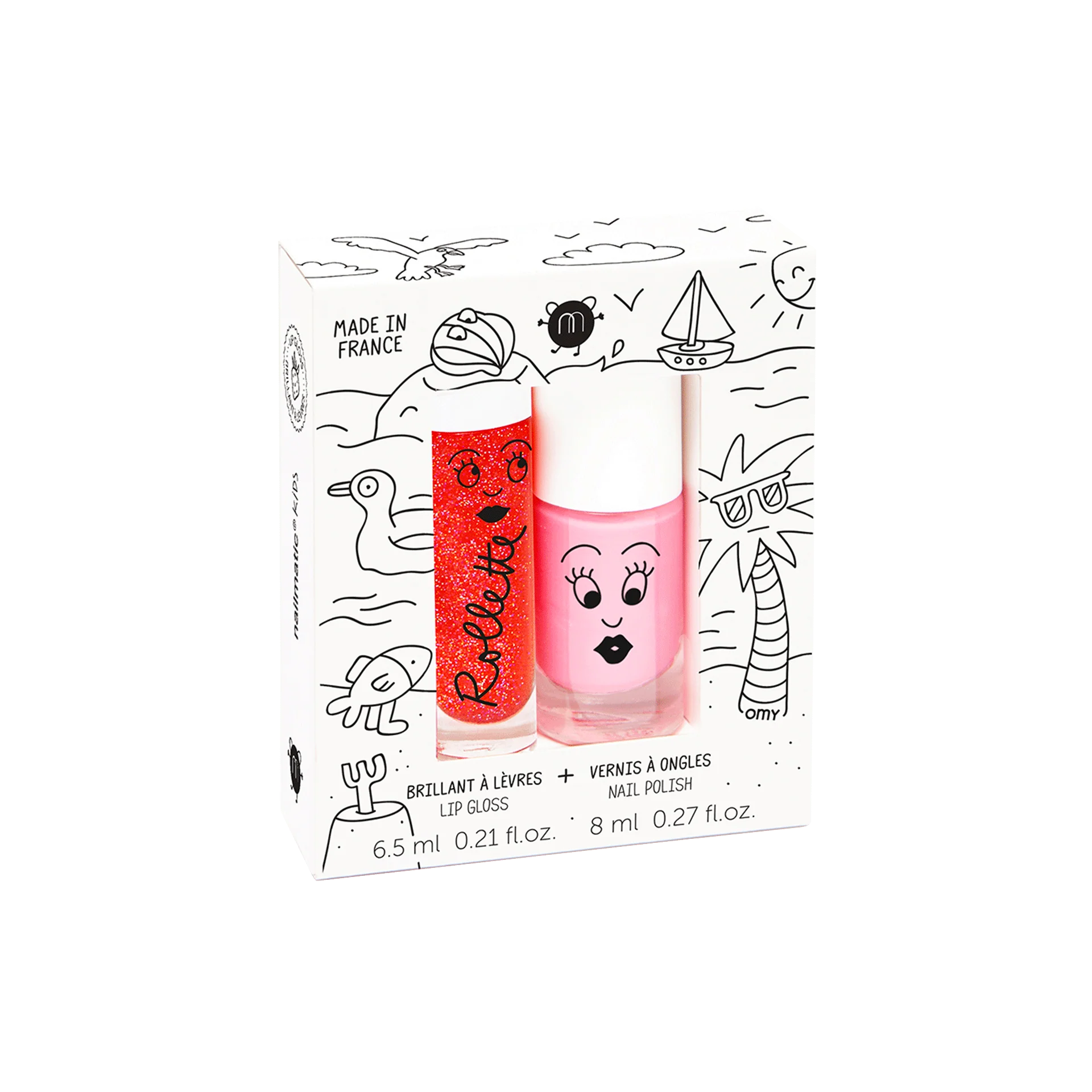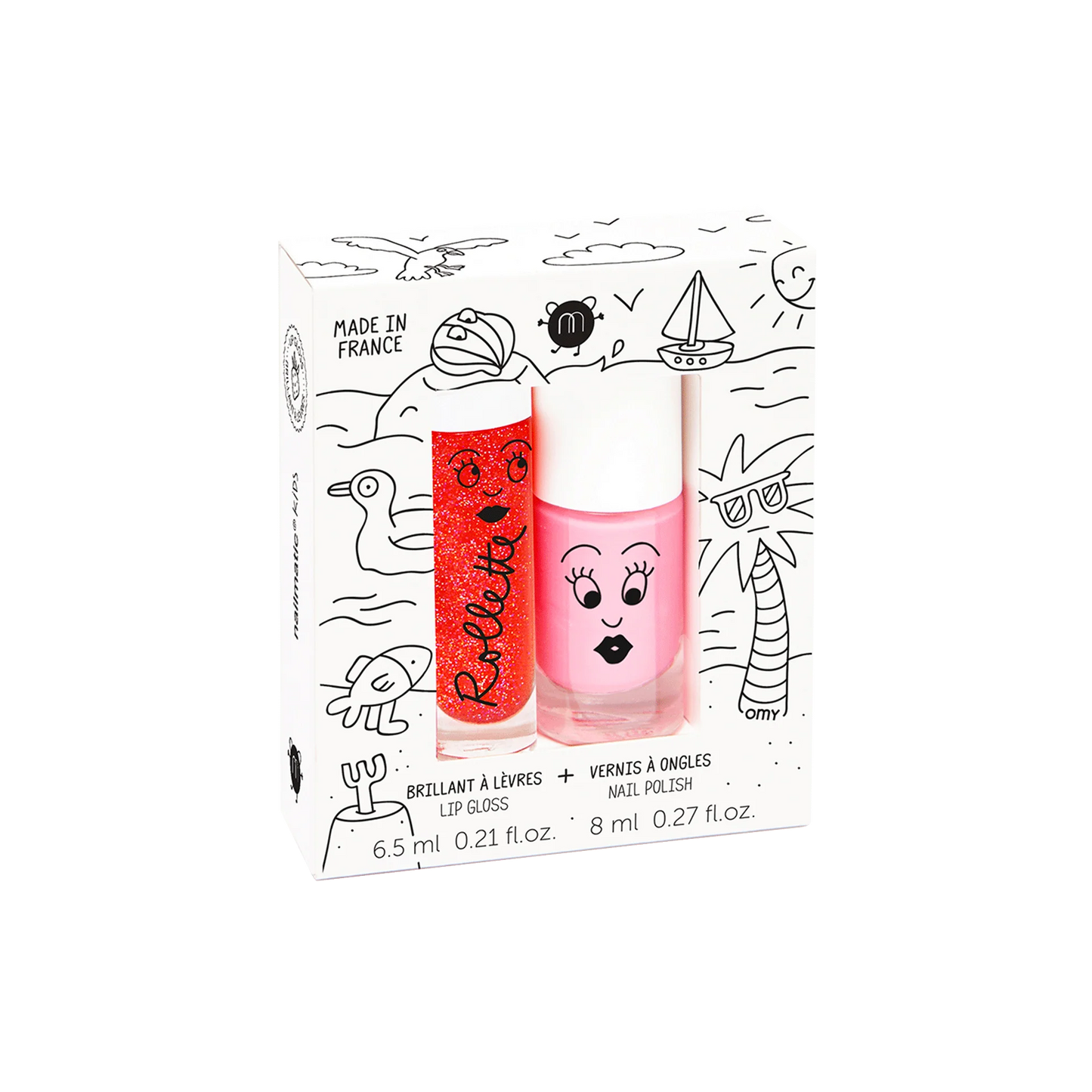 The ultimate beauty kit for a budding beauty fan: Cookie pink nail polish and strawberry Rollette lip gloss. Prettiness guaranteed with this dreamy-cool super duo!