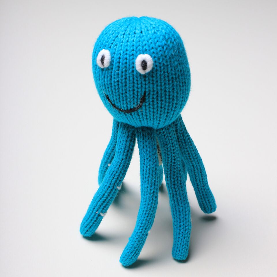 Part of Estella’s beach-themed collection of organic baby toys, the octopus rattle is a charming and fun loving companion for baby. This animal rattle toy is available in a cheerful aqua hue and its 8 tentacles, quirky smile, and soothing rattle sound are all sure to delight and entertain baby.