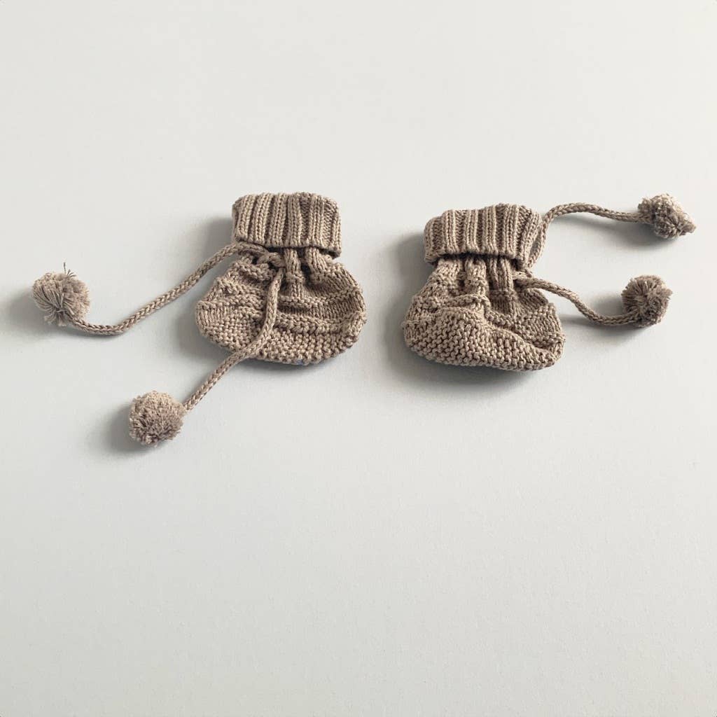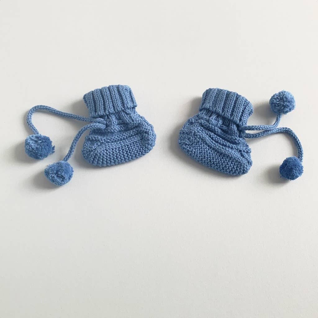 What better way to protect those precious little piggies than with a pair of hand-knit baby booties?! Made from the softest organic cotton, these baby booties are beautiful and actually stay on! With an adjustable tie that hugs baby's ankles, these booties are a keepsake that won't run away and disappear. Generally fits little feet from 0-6 months.