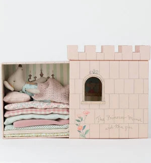 Become enchanted with the most recent Maileg take on the Princess and the Pea! This Princess, wearing a stunning blue and gold sparkle dress, comes in a keepsake castle box that slides open and closed. Just like in the story, princess mouse can still feel the pea even with the many mattresses that come in this cute set... how charming!