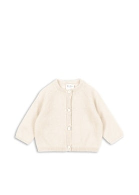 Exceptionally soft and comfy wool cardigan designed with mother of pearl buttons in front, decorative rib hems, and raglan sleeves. The perfect layer to keep your baby warm and comfortable at all times.