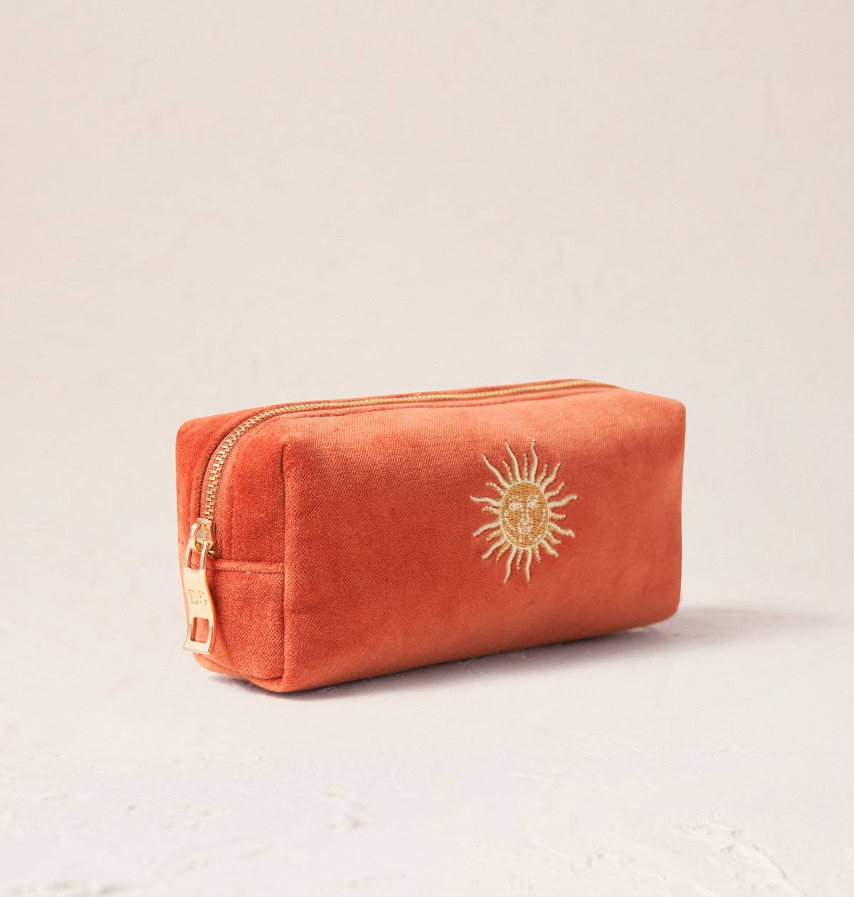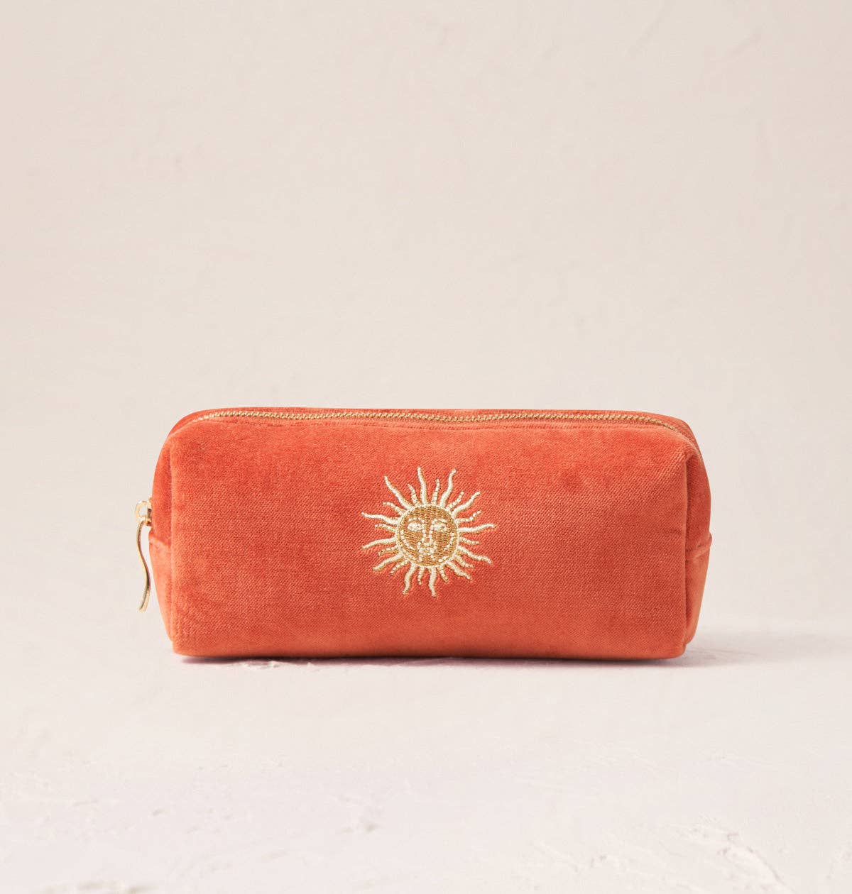 Elizabeth's hand-drawn sun motif is emblazoned onto a soft velvet base, with intricately embroidered gold and vanilla threads. She has depicted the sun with a human-like face, imagining our most powerful star as a character who radiates warmth and life.
