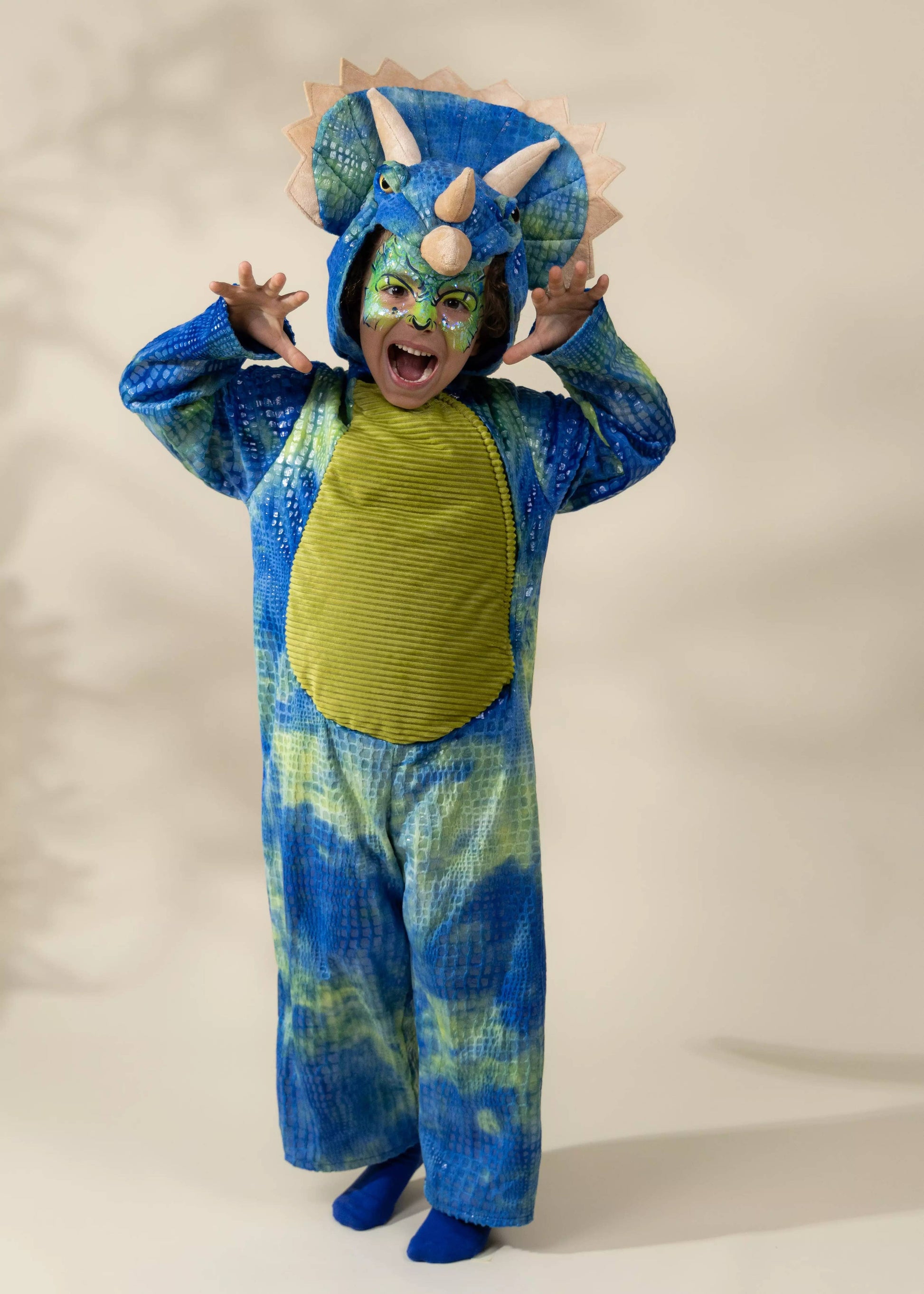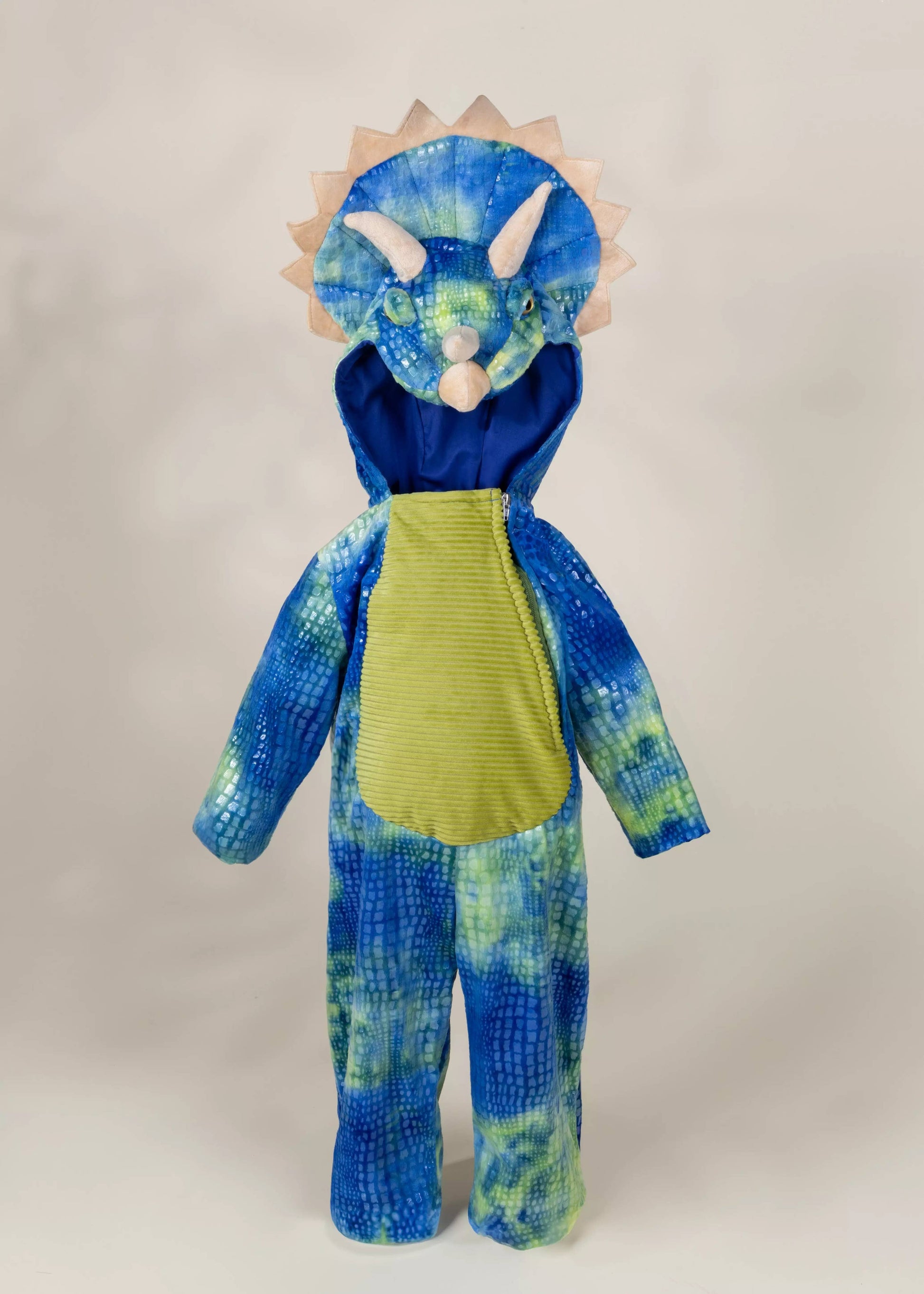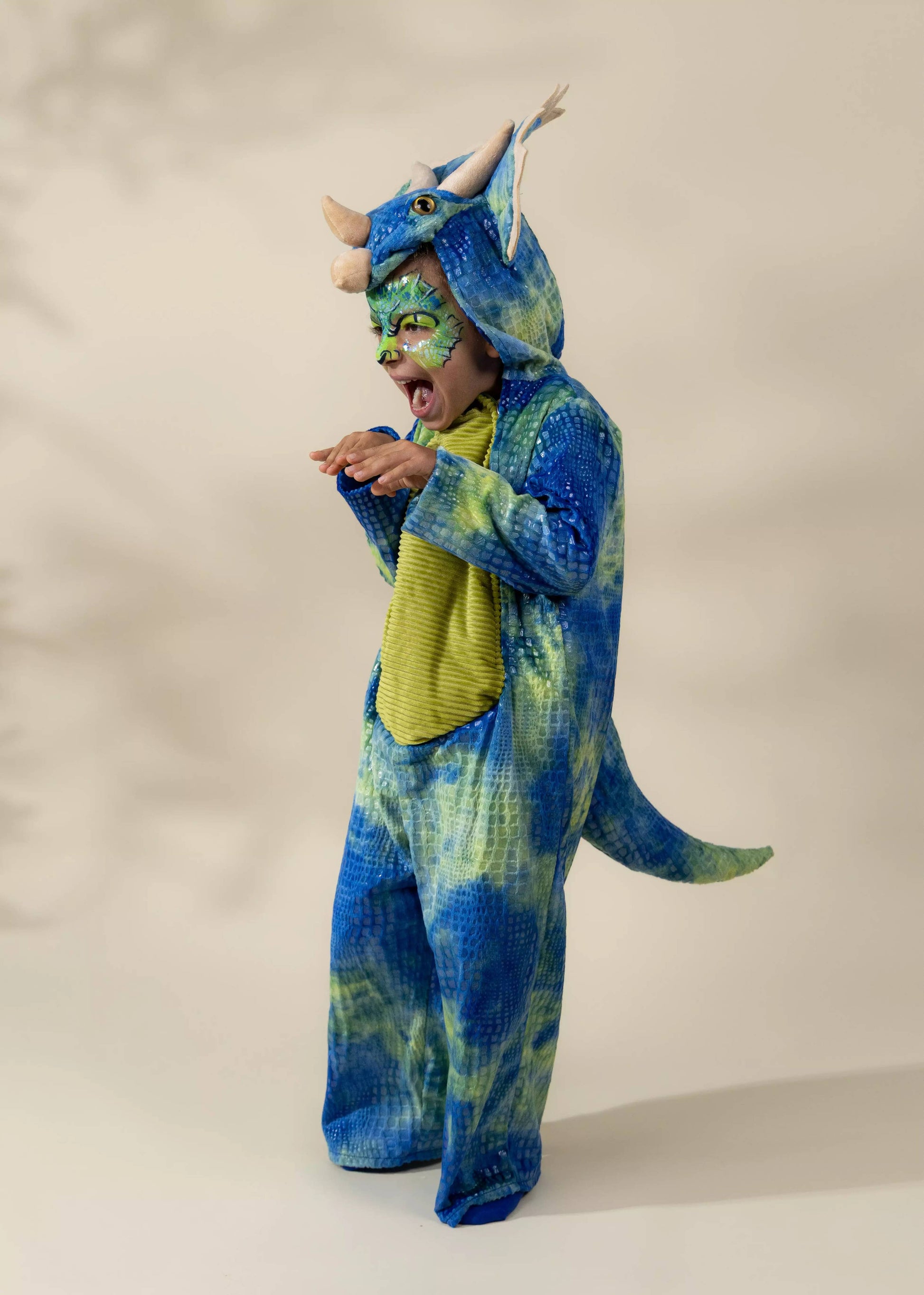 Roar into prehistoric playtime with our vibrant Triceratops Dino Costume! With its blue and yellow tie-dye design plus a three-horned dinosaur hood, this cozy one-piece brings the Jurassic jungle to life. A must-have for every young paleontologist in training!