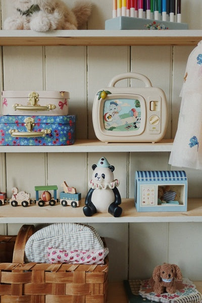 Sweet little musical TV toy for the youngest. Activate the moving screen by turning the button counter clockwise. The pictures on the screen will follow the soothing sounds.