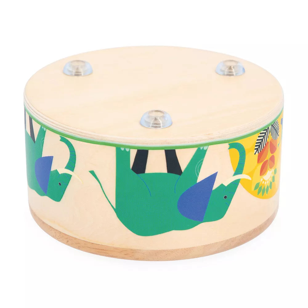 Drum away baby! Discover our wooden baby drum that’s suitable for budding musicians aged 18 months and up. This musical toy will introduce your child to the joys of music and promote their sound awareness. This wooden drum can easily be grasped, even by little ones. Pick up the drumstick and prepare to make sounds resonate. Thanks to this early-learning musical toy, little ones can explore the world of music and develop their sense of rhythm! Its key to introduce babies to a variety of sounds from a very early age. This will help with their development, whilst also keeping them entertained! And if there's one thing your child is bound to master at around 18 months, it's drumming and banging their toys. It is in these moments that they understand the cause and effect relationship. By gifting them a toy musical instrument, you are reinforcing this learning, whilst introducing them to sounds! This little drum measures 15.5 cm in diameter and also features all-over beautiful illustrations: the adventures of a young elephant. Offer this early-years toy to baby and narrate this story, show them how to make music and give them room to experiment! Little ones will be surprised by the soft sounds this wooden drum can produce. This toy musical instrument is part of our Gioia range; a joyful musical awakening is in store for little ones as they discover many a sound in a fun, sharing-focused way. FSC™-certified wooden toy.